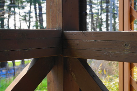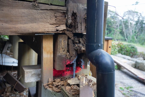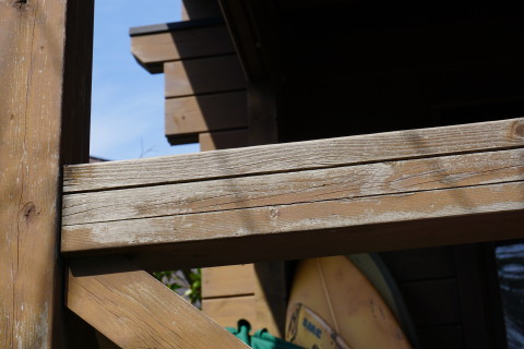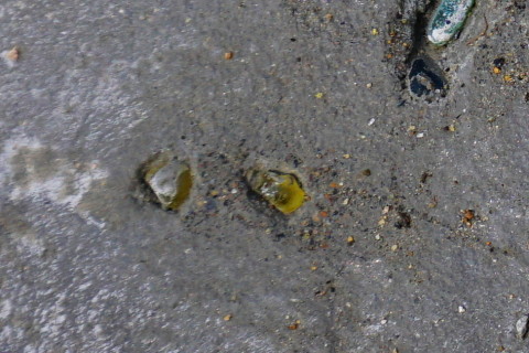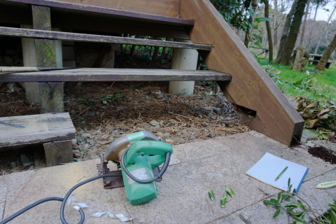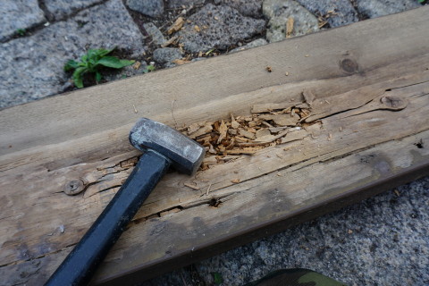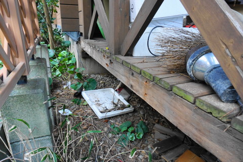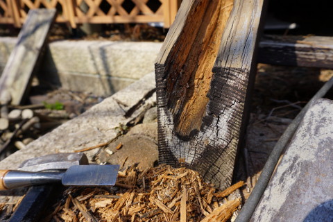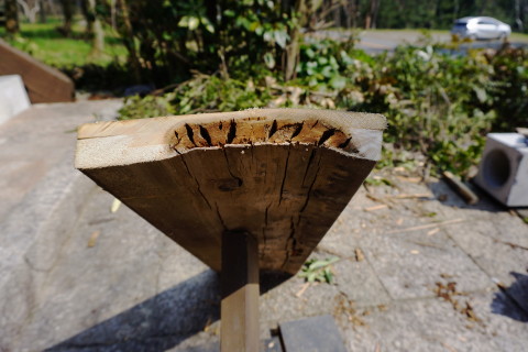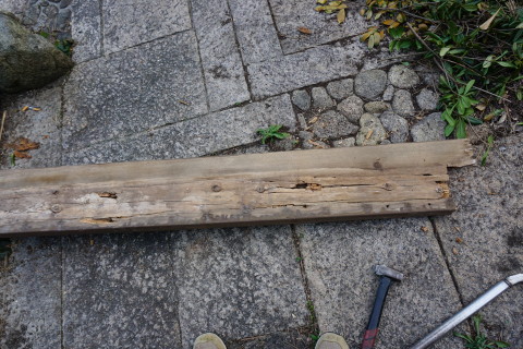 海の家 2017/04/03 とりあえず一段落 3月17日にハツリ始めて 18日19日とでセメントできたの五分の一ほど なかなか骨が折れる作業のこと........ いちおうタイヤで踏む場所だから 割れぬように そこそこ厚目にセメントしないと駄目だし これと並行して海の家の室内家具の配置換えなどもしておると まだまだ時間が掛かる そもそもなんだけど いつも自宅で昼メシ食べて出るから 半日作業になってるんだよな 何度も往復してるからゲソリン代が....... 自宅で昼メシ食うのも節約の為なんだけど......... ということで なんとしてでもあと1日か2日で終わらせたい ということで さらに23日24日とで やっと終わった.......... これ、全部で60箇所以上あっただろ......... 腰が痛い~ これも忘れずに埋め込んだった 4の下の黄色ふたつはシロクンの眼を表現してみた シーのグラスの黄色は なかなか貴重なんだ 砂の色と同化しちゃって見逃しやすいし 黄色のガラスボトル自体の漂着が少ないみたい 3月29日 キシベシローさんのコンビニでコーヒー買ってから向かう あれ? もう桜咲いてる? 毎年だけど ここの公園の桜は早咲きだな 便所の換気扇からの水の侵入だが 換気扇の外カバー上部のシリコーンが切れているから 雨水が入り込むんじゃないかと思って シリコーンが切れている部分に上塗りしてやろうと脚立に上って確認してみたら そもそもシリコーン施工がしてないじゃないの........ どういうことだよ一体........ やっとこ....... 換気扇カバーにシリコーン詰めながら ふと窓の ひさし に目を遣ると なんか反り繰り返ってるし 釘が半分以上飛び出しているんだが.......... ど、どのようにしてこのようなことに? こちら側は西日が当たるから劣化が激しいから ひさし木材が膨張と収縮を繰り返して それの圧力で釘が飛び出したのか? それとも風で煽られて ひさし ごと跳ね上がった? よく分らんけどペーパーがけしてオイルステイン塗っとこ それから 腐っていること確実なデッキの幕板を 取り外してみたら 幕板だけでなくデッキ床垂木まで腐っていた 釘がちっとも利いていない箇所があった 取り外した幕板の内側を 軽くハンマーで叩いただけでボロボロ崩れる 参ったなこれは 幕板、床垂木、さらに柱まで腐りきっておる 過去に1度ジャッキアップして柱の近くに支えを設置したるから それが利いているだけかも知れん どうしようこれ困ったな 俺は大工ではないから柱を挿げ替える技術とか無理ですぞ うーーーん うーーーーーーーん 見なかったことにしよう! 同じように腐った1段目の階段を半分に切断 今日はもう疲れたから終了 3月30日 支柱用の基礎コンふたつで丁度だったから とりあえず設置 デッキで休憩中に気付いたけど あそこの部分....... 7~8㎜ズレてるな........ やっぱり正面から見て左に足元沈んできているようだ うーーーん 見なかったことにしよう 昨日取り外した幕板を観察 水を吸って腐って繊維がグズグズになっている そいうとこにシロアリさんが寄ってきて このようにコロニーになる 何度か粉末状のアリの巣コロリを巻いて全滅させたことがあるが 夏の間に次から次へとアリたちは遣ってくる ということで アリの巣コロリが効果あるということは シロアリではないようなんだよな シロアリにはアリキラーは効かないとアリ殺虫剤の説明にも書いてあると思う なんか小粒の黒アリなんだよ なんていう名前のアリなんか知らんけど こちらアリに食われた訳じゃなくて 水腐れした階段の側桁部分の死んでいる箇所を穿り出したところ 致命傷の虫歯みたいになってしまったな 見なかったことにしよう さて ここんとこ毎日帰宅時間が午後7時過ぎになってしまっていたから 今日は早く帰ろう ほんと ニートにあるまじき活発さを発揮してしまった アリさんコロニー 樹脂で固めて壁に飾れば芸術作品のよう 作業してるときに拾ったタマムシさん?の羽カバー 美しい パリッパリッ クッチャクッチャ うん、まあまあの味だな。